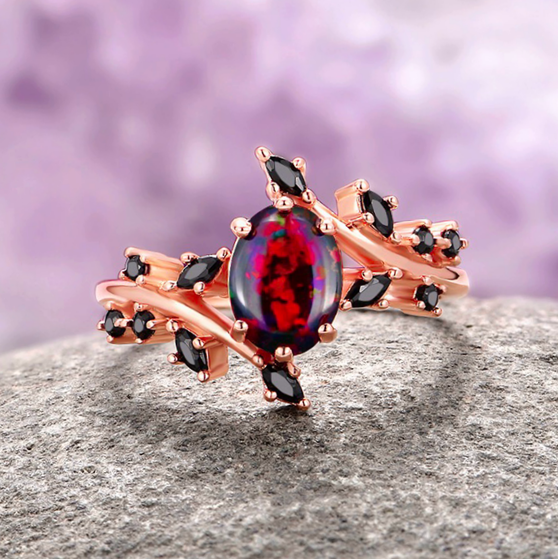 Black Fire Opal & Onyx Leaf Ring- 14K Rose Gold Vermeil