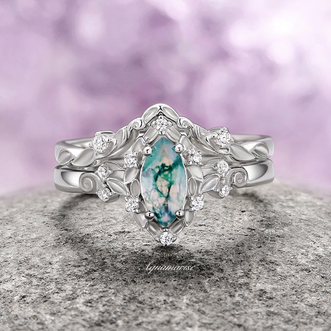 Fairy Green Moss Agate Engagement Leaf Ring Set- 14K White Gold