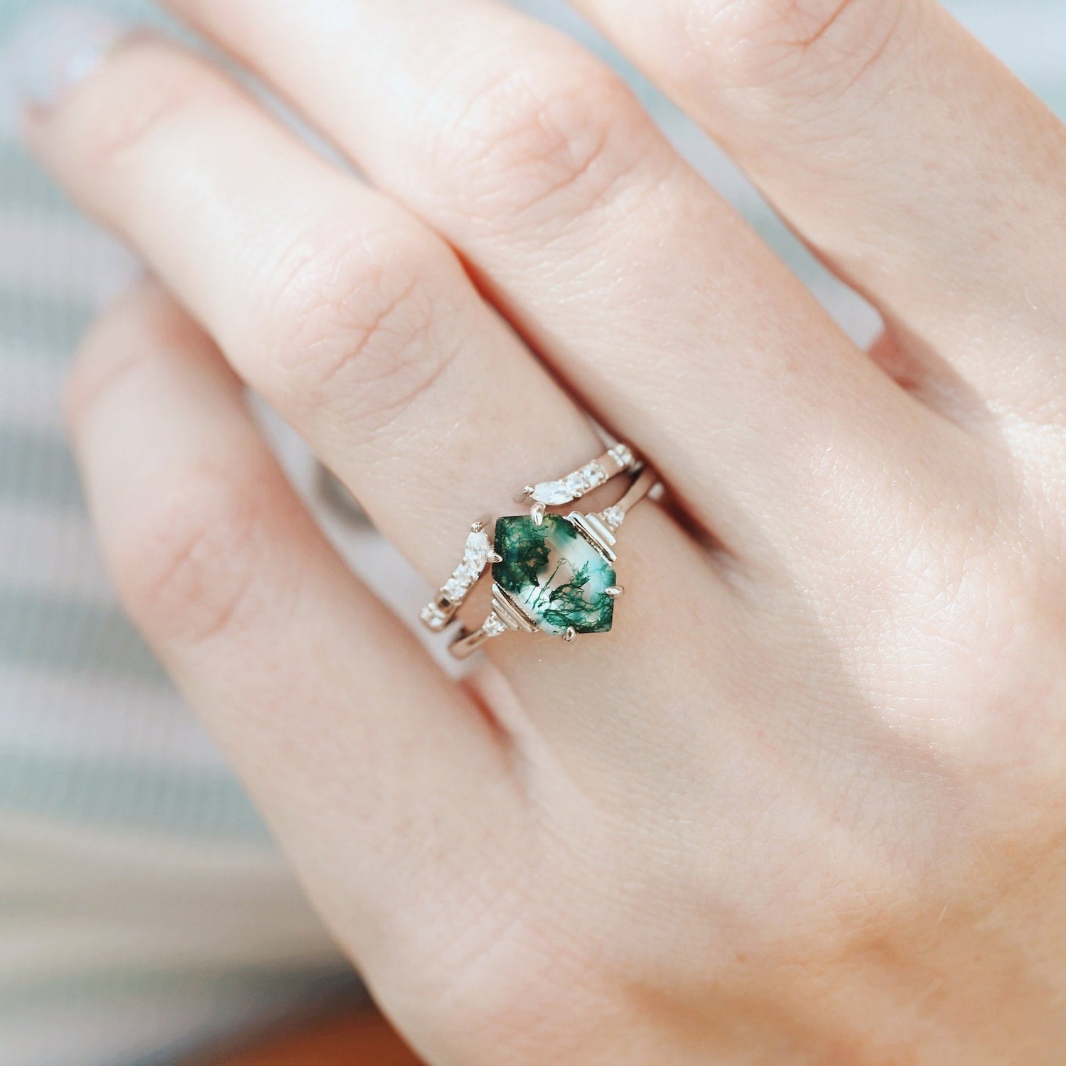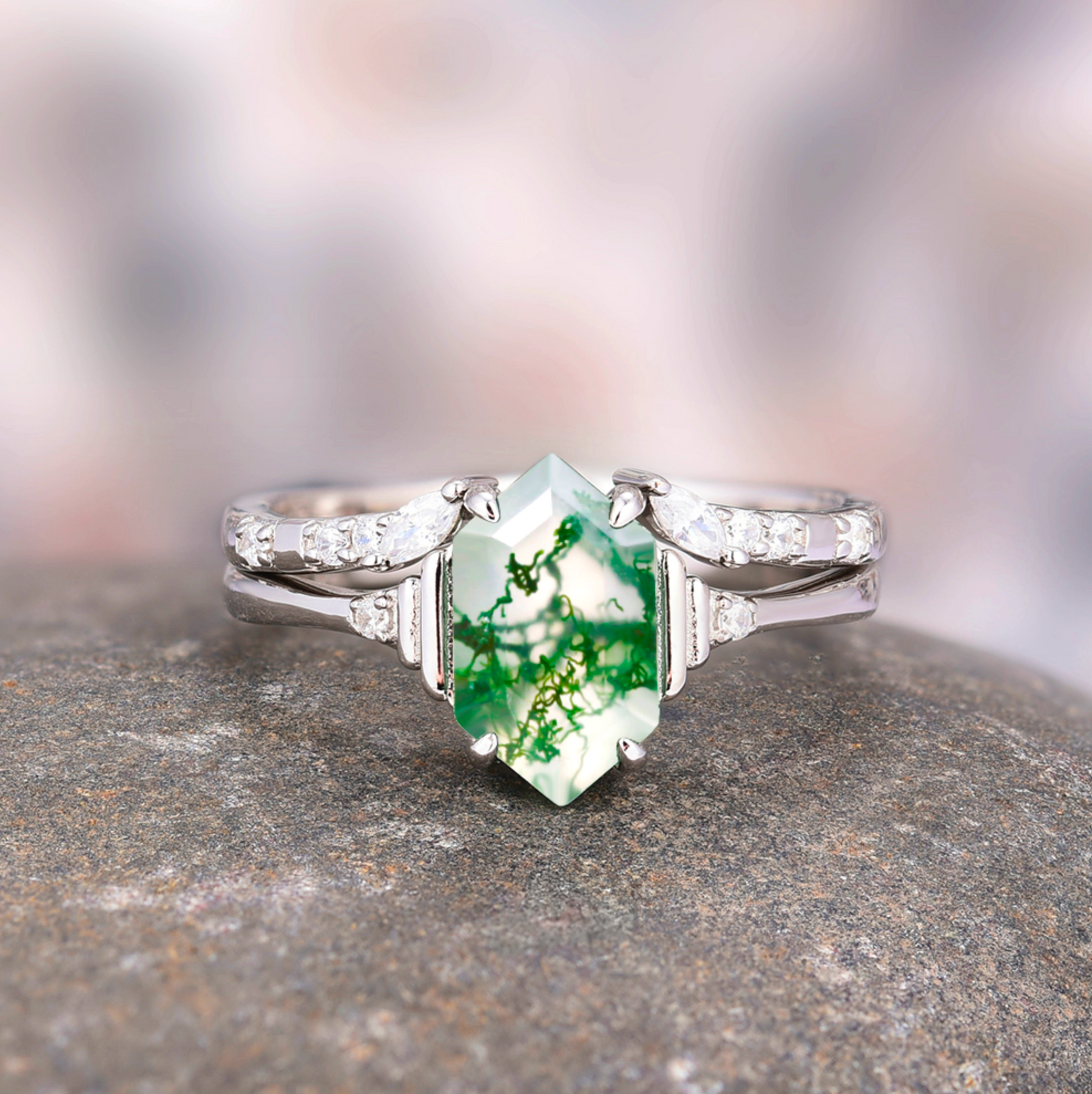 Hexagon Green Moss Agate Ring Set- 925 Sterling Silver